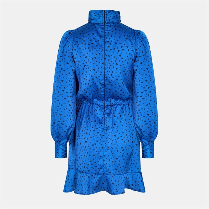 Stay trendy with this Blue And Black Printed High Neck Skater Dress! Features a ruched high neck collar, long sleeves with buttoned cuffs, a skater style skirt and a zip up back. Style black heeled boots and a matching clutch.