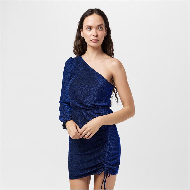 Blue Sparkly One Sleeve Ruched Side Mini Dress