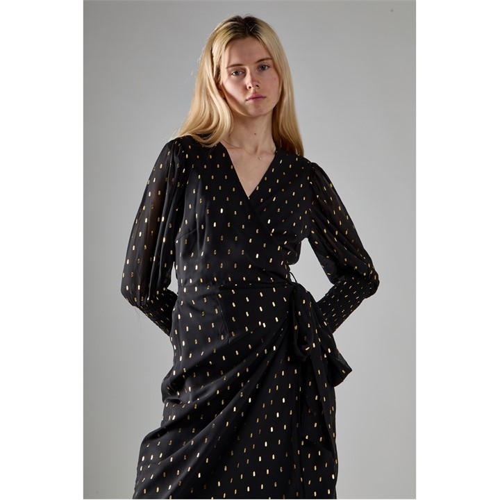 Glamorous Women's Black with Gold Spot Long-Dress. This Black Gold Spot Long Dress brings effortless charm to your wardrobe. The Black colour creates a lush backdrop for delicate gold spots that add a touch of shimmer and warmth to the fabric. With its flattering V-neckline and adjustable tie waist, this dress offers a custom fit that highlights your shape with comfort. The long, flowing silhouette drapes beautifully, offering a soft, relaxed look that still feels put-together. Style it with a cozy cardigan for chillier days, or pair with simple accessories to let the elegant pattern take centre stage. Perfect for dinners, gatherings, or just an elevated everyday look, this dress keeps things both relaxed and refined.